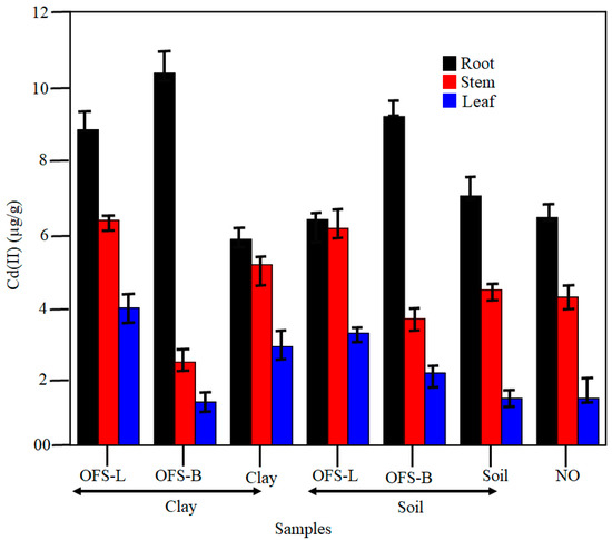 Plant uptake has been shown to have similar effects. In general, the plant exhibited capillary rise adsorption, and loosely bound Cd (II) in wettable clay or soil samples had higher uptake, as seen by plant Cd (II) removal and biomass data. Meanwhile, aggregation formed near plant roots with OFS-B modified clay or soil, resulting in a larger amount of Cd (II) in the root than in other plants. Because of their carrier transforming role in the bioretention system, wettable OFS-A modified clay demonstrated high Cd (II) removal capability, according to the results.