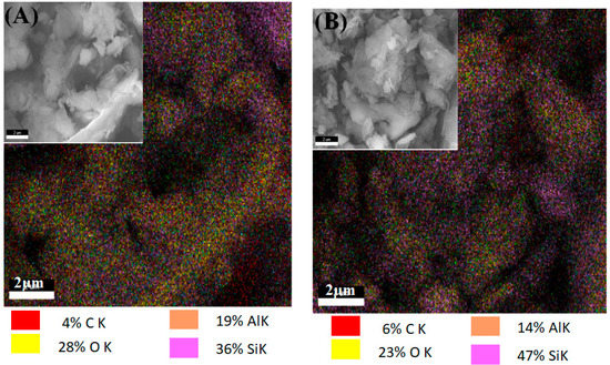 According to the findings of the above study, the aspect of the additional layer added to the bioretention system has an impact on the Cd (II) removal rate. Furthermore, the wettability of clay and soil is affected by silane alteration, as evident by the above-mentioned data. However, scanning electron microcopy with EDAX was performed on OFS-L and OFS-B modified clay samples to prove structural property correlations. Figure 7A,B shows SEM images of two clays, Clay OFS-L and Clay OFS-B, as well as EDAX mapping of the clays. OFS-B clay has more carbon than OFS-L clay in terms of silane modifier dispersion on the surface. This conclusion is due to the molecular carbon number ration, as OFS-B has more carbon (structural) than OFS-L. However, there is a noticeable variation in certain Al and O components. The findings point to the presence of clay structural Al on the surfaces. Long-chain quaternary ammonium salt modifier enters the interlayer mostly over the surface, according to earlier research. Benzyl substituted quaternary ammonium salt modifier, on the other hand, is mostly left on the surface [27]. In the case of silane-modified clays, similar behavior has been found. EDAX backs up these findings with Si elemental measurement. The OFS-B had a higher amount of Si on the surfaces than OFS-L, as can be observed.
