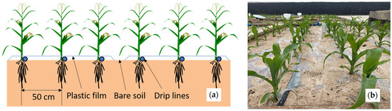Schematic diagram of maize planting with drip irrigation under mulch (a) and photo (b).