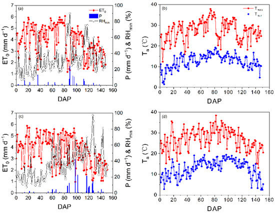 Daily variations of reference evapotranspiration (ET0), precipitation (P), daily minimum relative humidity (RHmin), and maximum and minimum air temperature (Tmax and Tmin) with days after planting (DAP) during the whole growth period of maize in 2017 (a,b) and 2018 (c,d).