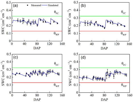 Table 3 shows the initial and calibration values of the main model parameters. After calibration, the Kcb of maize with drip irrigation under mulch at the initial stage (Kcb-ini), mid-season stage (Kcb-mid), and late season stage (Kcb-end) were equal to 0.2, 1.15, and 0.55, respectively. The values of Kcb obtained in this study were similar to those in the existing studies and sit within the reviewed and updated range of Kcb for field maize based on accurate crop ETc measurement and FAO56 method by Pereira et al. [34]. Chauhdary et al. [35] presented Kcb-mid = 0.93, Kcb-end = 0.47 for dripped maize with high grain moisture; they used the SALTMED model and gravimetric SWC measurements in Faisalabad, Pakistan. The experimental results achieved by Gimenez et al. [11] in western Uruguay showed that Kcb-ini = 0.15, Kcb-mid = 1.05, and Kcb-end = 0.3. Martins et al. [36] studied maize with sprinkling irrigation and drip irrigation under organic film in southern Brazil and showed that Kcb-ini = 0.2, Kcb-mid = 1.12, and Kcb-end = 0.2. Rodrigues et al. [37] conducted a study on maize under full irrigation and deficit drip irrigation in Portugal and found that Kcb-ini = 0.15, Kcb-mid = 1.15, and Kcb-end = 0.4. Paredes et al. [38], in Portugal, showed by using the AquaCrop model that KcTr,x = 1.18. Paredes et al. [12] in 2014 showed that Kcb-ini = 0.15, Kcb-mid = 1.15, and Kcb-end = 0.3. Yan et al. [39] studied summer maize under different drip irrigation conditions using the SIMDualKc model in Yangling, Shaanxi, concluding that Kcb-ini = 0.15, Kcb-mid = 1.13, and Kcb-end = 0.2. Zhao et al. [40] studied summer maize in Beijing, concluding that Kcb-ini = 0.2, Kcb-mid = 1.1, and Kcb-end = 0.45. Li et al. [25] studied maize by drip irrigation under mulch in northeastern Inner Mongolia, concluding that Kcb-ini = 0.15, Kcb-mid = 1.05, and Kcb-end = 0.4. The slightly higher Kcb-end might be due to the incomplete senescence of maize.