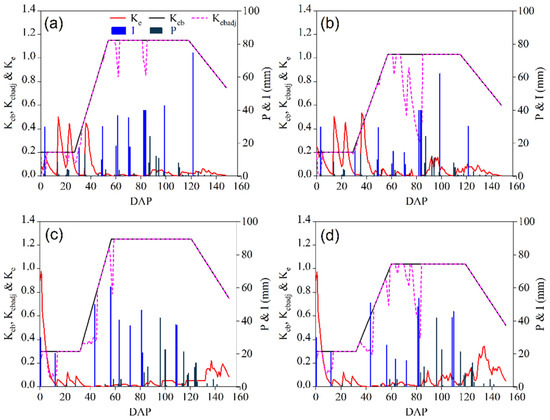 The SIMDualKc model calculates daily crop ETc by considering both Es and Tr based on the soil water balance and dual Kc method [9,28]. In the model, actual crop ETc is computed as follows: