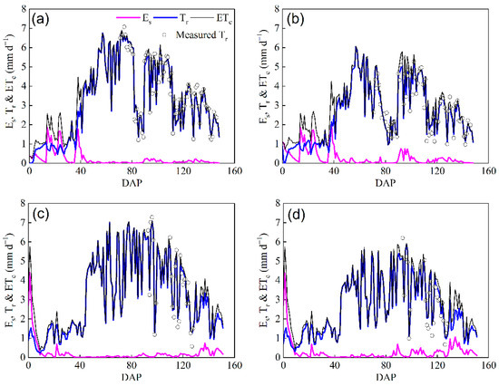 Seasonal variations of simulated evapotranspiration (ETc), transpiration (Tr), and soil evaporation (Es), and measured Tr for two water treatments (T1 and T2) with days after planting (DAP) during the whole growth period of maize in (a,b) and 2018 (c,d).