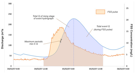 In order to calculate the event FSS load and event discharge characteristics, it is necessary to segregate a rainfall runoff event from the annual stream discharge data by analyzing the rise and fall of FSS concentration in the stream pertaining to a rainfall event. Discharge and FSS data were plotted on the y-axis and the timeline on x-axis (as shown in Figure 1) for each water year (31st August to 31st August) from 2005 to 2015. An FSS concentration of 2–5 mg/L was considered as the base flow level. Each event resulting in an FSS pulse where the sedigraph rises and reaches a peak concentration >5 mg/L was identified. The start of the FSS pulse was taken as a point where the sedigraph started to rise with a steep slope up to a peak value. The end of the FSS pulse was taken as a point on the sedigraph where the slope of the receding part of sedigraph was first parallel with the x-axis [36]. Here, the event FSS loads and event discharge for corresponding rainfall-runoff events are thus determined by adding instantaneous discharge and FSS loads corresponding to the time intervals from the start to end of an identified rainfall–runoff event. It is also same as the shaded area under the graph shown in Figure 1 for event discharge and event FSS loads, respectively.
