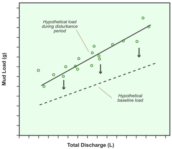This method was proposed to assess if the post-closure landform was returning to “equilibrium” with its surrounds. However, based on the LEM studies done on Ranger mine, it is more appropriate to assess if the landform was in disequilibrium changing to equilibrium. Earlier studies show that during construction of the landform, surface material is disturbed, and large volumes of sediment will be made available for transport. Therefore, it is expected that immediately after closure, FSS concentration/loads will be elevated and observed loads will be higher than predicted using the derived equation. This means that the best fit line for the relationship post-disturbance will move in an upward direction and as the disturbance equilibrated, the best fit line moves downwards to the undisturbed state (Figure 2). This was confirmed by Moliere and Evans [36] who fitted relationships for 6 sites and amended Equation (1) as follows: