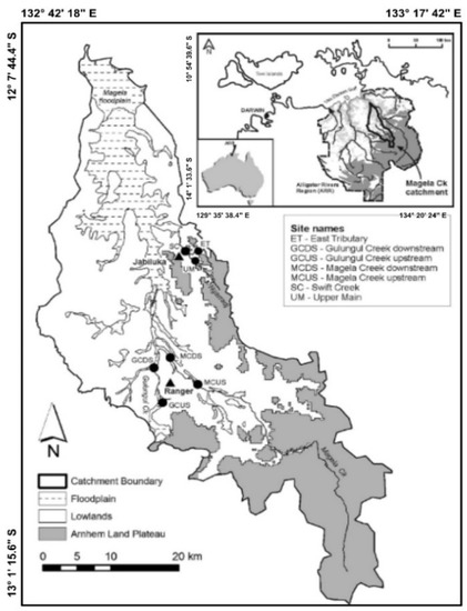 Ranger mine (12°41′ S, 132°55′ E) is an open cut uranium mine operated by Energy Resources of Australia Ltd. (ERA) and is in the Alligator Rivers Region of the Northern Territory, Australia. The mine is located 8 km east of the township of Jabiru and within the 78 km2 Ranger Project Area which is surrounded by, but separate from, the World Heritage listed Kakadu National Park (Figure 3). The Ranger mine is adjacent to Magela Creek, a tributary of the East Alligator River [6]. Gulungul Creek is a small tributary of Magela Creek that is adjacent to the tailing dam. It is one of the tributaries that would be the first to receive sediment generated from the mine site during and after rehabilitation [20]. Gulungul and Magela Creeks are ephemeral sand-bed braided streams which carry very large sand loads (bed and suspended bed) and small FSS loads.