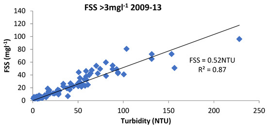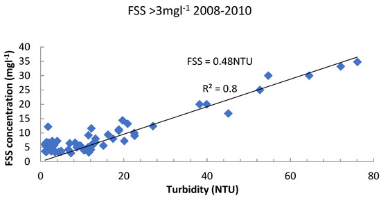 FSS data could not be collected for each rainfall event, but NTU data can be used as a surrogate for FSS [37]. The NTU–FSSNTU–FSS relationships at each site in Gulungul and Magela Creeks can be used to accurately estimate FSS and create a continuous FSS record. The relationship can vary between sites and with different instruments and it is important that the FSS data be collected regularly to update and confirm the FSS–NTUFSS–NTU relationship. The FSS–NTU relationship was plotted with available data for each gauging station and the equation of the best fit line was calculated using the trendline function in Excel. Trendlines were calculated using the exponential and linear options and the trendline with the highest R value was used to determine the FSS–NTU relationship. Hence, the FSS concentration was determined using the equation from the trendline and the continuous NTU data collected.