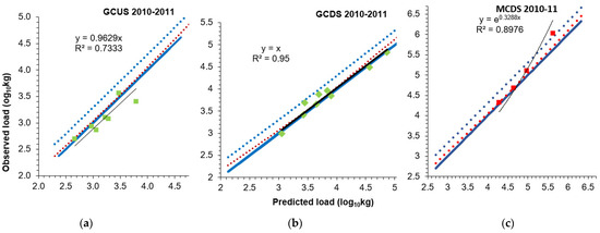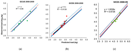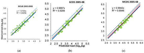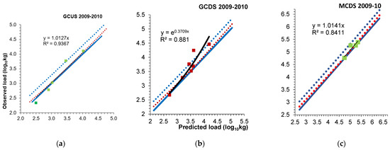 Events for water years from 2004 to 2015 were analysed to assess the impacts of the trial landform constructed in 2008, with respect to elevated FSS event mass. In Figure 7, Figure 8, Figure 9 and Figure 10, the relationship between predicted event log10 FSS load for GCUS, GCDS, and MCDS (Equations (7), (8) and (10)) and observed event log10 FSS load (Equations (4)–(6)) are shown. Individual event data for Gulungul and Magela Creeks are shown in Appendix A.