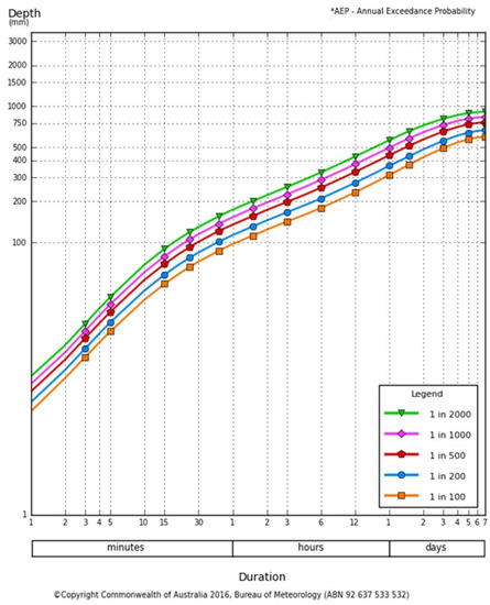 - Bureau of Meteorology. Design Rainfall Data System. 2016. Available online: http://www.bom.gov.au/water/designRainfalls/revised-ifd (accessed on 7 August 2021).