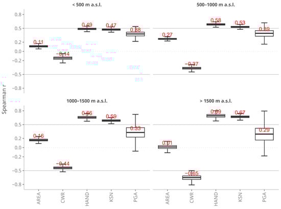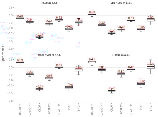The distribution of 1000 Spearman’s rank correlation coefficients between the corrected SSY (Equation (4)) and simulated controlling landuse/landcover factors (Equation (5)) grouped by altitude zone. Every value was retrieved by calculating the correlation between randomly generated sets of SSY and controlling variables (Section 2.4). The red values represent the median Spearman r score.
