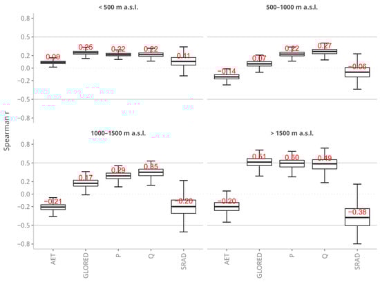 The distribution of 1000 Spearman’s rank correlation coefficients between the corrected SSY (Equation (4)) and simulated controlling climate factors (Equation (5)) grouped by altitude zone. Every value was retrieved by calculating the correlation between randomly generated sets of SSY and controlling variables (Section 2.4). The red values represent the median Spearman r score.
