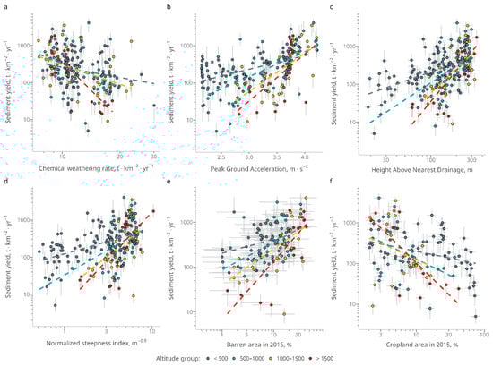 Scatter plots of the SSY values versus the CWR (a), PGA (b), HAND (c), Ksn (d), barren (e), and cropland (f) areas. Circles indicate the observed SSY values, while error bars indicate the 95% confidence interval (see Section 2.4).
