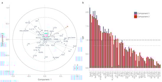 (a) PLSR (model B) correlation circle, illustrating the correlations of SSY (Y) and controlling factors (X) with the first two axes associated with the first two components. The percentages of the variances in X and Y explained by each variable are indicated on the respective axes. The inner dashed circle denotes the r = 0.7; (b) Controlling variables importance (i.e., VIP) distribution.