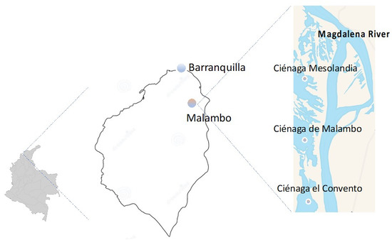 Water is a critical resource for all living beings on earth; however, we face a great ecological challenge today, due to rapid urbanization and human anthropogenic activities [1]. Contaminants such as organic and inorganic pollutants are delivered into the water affluents (e.g., ponds, lakes, streams, rivers, and oceans). These pollutants reduce light penetration and photosynthesis [2,3]. Currently, climate change indicators demonstrate the challenge that humanity is facing (e.g., CO2 atmosphere level, earth temperature, ocean temperature, glaciers and sea ice melting, global sea level, ocean acidification, and extreme climate) [4,5]. Among these indicators, the ocean’s acidification is increasing due to eutrophication [6], where an accumulation of plants and cyanobacteria is produced. These species will eventually decompose, affecting the pH and the aquatic species in the environment [7]. Thus, the cyanobacteria species can lead to hypoxia from effluents and disrupt trophic ecosystems [8]. In the Caribbean region, several swamps present this type of cyanobacterial bloom. Due to their potential risk, these species can affect the water consumption involved in different applications (e.g., drinking water, irrigation, fishing, and recreational waters) [9]. In the Colombian Caribbean region, there is an important muddy area made up of three swamps: the swamp “Ciénaga Mesolandia or Bahía”, the swamp “Ciénaga Grande de Malambo” and the swamp “Ciénaga el Convento” (see Figure 1). The swamp Ciénaga Grande de Malambo covers an area of nearly 225 ha, and its average depth is between 1.1 and 2.2 m in the low- and high-water seasons, respectively. This body of water presents a strong overload of organic matter produced by the discharge of raw domestic wastewater and by the construction of embankments on its only water exchange routes. This situation is critical for communities living near to the swamp, and this situation requires new alternatives to solve the contamination problem.