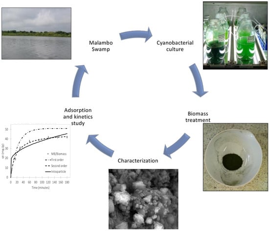 Finally, cyanobacteria have various potential binding sites, such as hydroxyl and carboxyl groups, which are present on the cell wall. It has been shown that these chemical groups are critical for the dye removal by means of a biosorption process [27,28]. In the present study, the potential application of the biomass (obtained from cyanobacteria) to remove MB from aqueous solutions as a potential solution to the cyanobacteria accumulation in the swamp is presented. Additionally, this study provides information on the kinetics and adsorption process parameters.