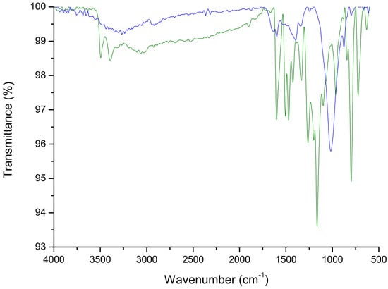 FTIR spectra of the obtained biomass (green line) and biomass/dye (blue line).