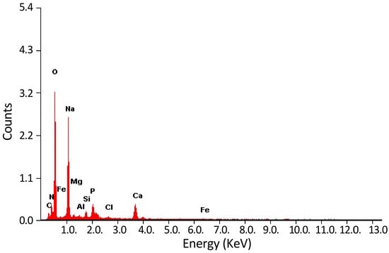 An EDX assay was conducted to determine the elemental compositions of the biomass; see Figure 4. The results indicate that the chemical composition of biomass was: 5.04% of carbon, 53.64% of oxygen, 13.47% of nitrogen, 19.44% of sodium, and 3.40% of calcium with some other trace chemical elements. The abundance and components revealed by EDX are consistent with the FT-IR results. The high percentage of carbon, nitrogen, and oxygen is a typical requirement to enhance the adsorption of dyes by the biomass.