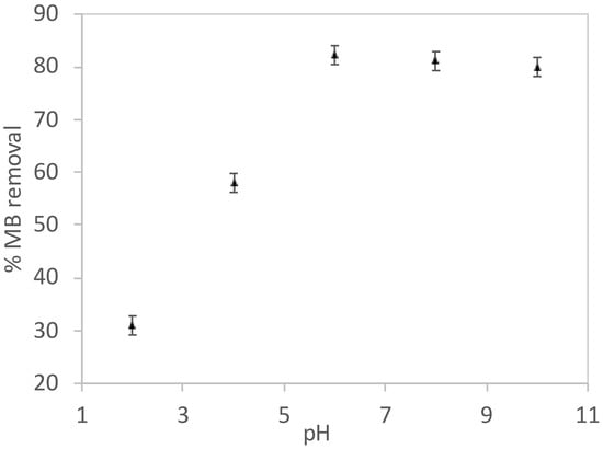 An important controlling parameter in the adsorption study is the pH value. This parameter affects chemical groups on the biomass surface and also influences the ionization of the dye molecules [43]. Thus, we studied the pH effect in the range from 2.0 to 10.0. Figure 6 shows the pH’s effect on the percentage (%) of MB removal.