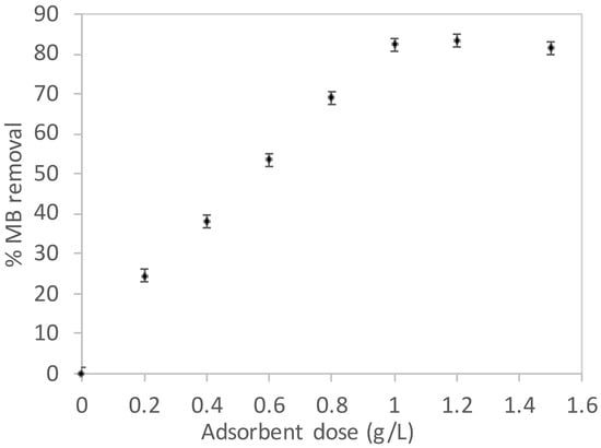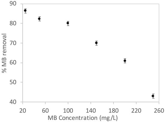 The %MB removal increased as the biomass concentration was higher as the active sites available on the biomass surfaces increased due to a higher biomass dose [46]. Figure 7 shows that the saturation limit is reached for doses higher than 1.0 g/L. This saturation behavior is associated with the reduction in the concentration gradient between the MB solution and the biomass surface [47]. Furthermore, Figure 8 shows the MB concentration effect on the removal process. Higher %MB removal was obtained at low concentrations, as more active sites are available on the biomass surface [48]. As observed, when the initial MB concentration increases at a fixed amount of adsorbent, the number of available sites decrease on the biomass surface, and therefore, the MB molecules compete for the active sites, decreasing the efficiency of the adsorption process [49].
