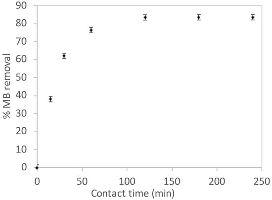 Figure 9 shows the effect of time on the adsorption process (15–240 min). The %MB removal increased as the contact time increased, reaching a plateau at an exposure time of 120 min. Thus, before this time, the active sites available are higher, and the adsorption is faster; this stage is controlled by the MB molecules’ diffusion from the bulk solution to the biomass surface.