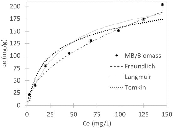 where C0 (mg/L) is the initial concentration of MB in the liquid phase, Ce (mg/L) is the concentration at equilibrium of MB in the liquid phase, m(g) is the biomass amount and V(L) is the volume of the solution [31]. The Langmuir (Equation (3)), Freundlich (Equation (4)) and Temkin (Equation (5)) isotherm models were used to study the adsorption mechanism of the MB on biomass [32,33]. The Langmuir model is expressed as follows: