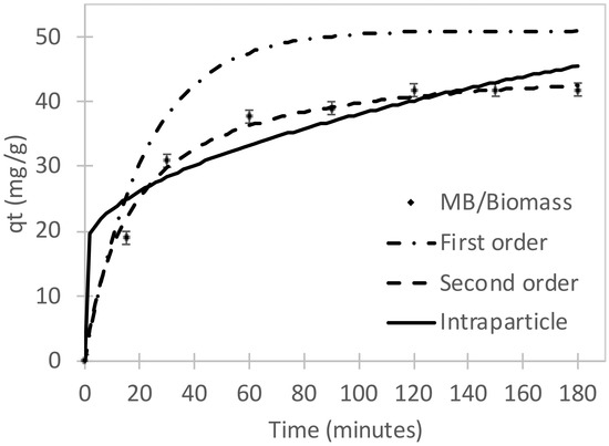 The kinetic mechanism for the MB adsorption on biomass can be studied indirectly using different kinetics models. In this work, we used three different models. Figure 11 shows adsorption kinetic data, and Table 2 lists the parameters for the fitting of the kinetics data. The pseudo-second order model (PSO) showed best-fitting regression values (higher R2 and lower ARE value). These results suggest that the chemisorption is the dominant interaction during the MB adsorption on biomass surface. In the case of the intraparticle diffusion model, the kinetics data fitting parameters showed the worst results for the three models; it has been reported that this model requires a faster mass-transfer rate for the first stage of the adsorption process [56]. These results indicate that the intraparticle diffusion is not the dominating mechanism for the adsorption of MB onto biomass, and thus this model is not suitable for describing the herein adsorption process.
