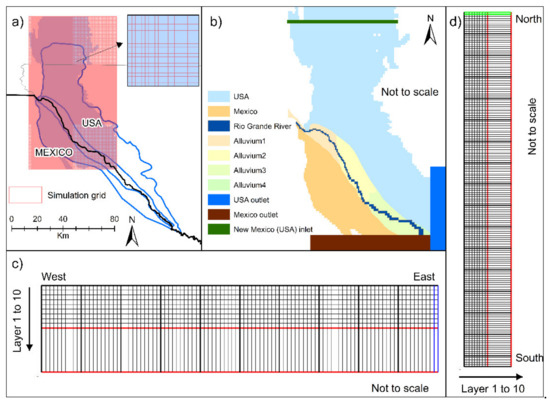 The latest model developed for the area of interest has a ten vertical-layers grid. The top nine layers are 30 m thick and the bottom layer is 276 m thick (Figure 3c,d). The first 30 m, i.e., the top layer, is set as alluvial deposits and the other remain as fluvial facies. The horizontal domain is represented with rectangular grids (Figure 3a). We simulated monthly water stress from 1969 to 2013. Groundwater levels measured at wells and pumping data were used to calibrate the model. The inflow boundary condition was set in New Mexico (shown in green in Figure 3b). Similarly, the outflows from the USA and Mexico were placed at the southeast corner (shown in blue and brown, respectively, in Figure 3b). Accurate boundaries of aquifers are hard to establish, especially for the connected aquifers (e.g., Hueco–Tularosa). Although no clear physical boundary separates the Hueco Bolson from the Tularosa basin, the recognized Hueco Bolson aquifer (Figure 1a and Figure 3a) does extend to New Mexico [31]. In the USA, groundwater in a shared aquifer is managed by each state [19].