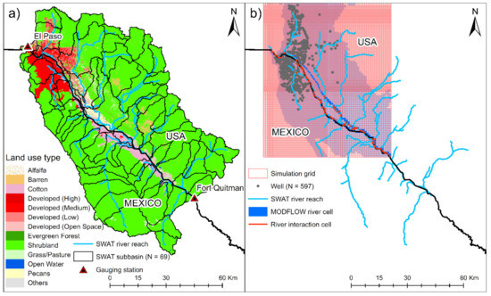 It is critical to analyze both the surface water and groundwater on either side of the border. We are developing a coupled watershed–groundwater model to simulate surface and subsurface hydrologic processes [57]. The Soil and Water Assessment Tool (SWAT) will be used as a watershed model that allows a better and fine resolution simulation of the surface water and land use activities. Figure 4a shows the subbasins (N = 69) of the SWAT model. The number of hydrologic response units (HRUs) in the SWAT model is 1243 (not shown in Figure). The water balance is maintained at the HRU level. The HRU is the smallest unit for the computation in the SWAT, which is delineated based on a unique combination of soil types, land use/crop type classes, and topography. Figure 4b shows the linking of HRUs with the MODFLOW grids and represents linking river cells and SWAT river reach.