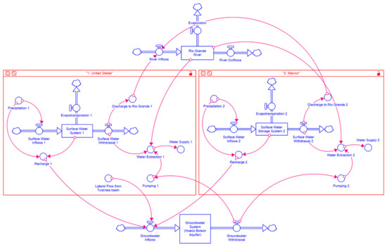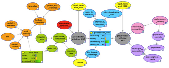 According to Sanchez and Eckstein [42], small-scale, informal, and non-binding approaches seem more viable for future transboundary groundwater management between Mexico and Texas. A holistic approach that captures the opinions of growers, stakeholders, and experts is necessary to address associated socioecological issues. The transboundary water rights can be modeled in the system model by generating different water allocations scenarios. However, binational interests are difficult to define without experts’ interpretation of casual chains [70,75].