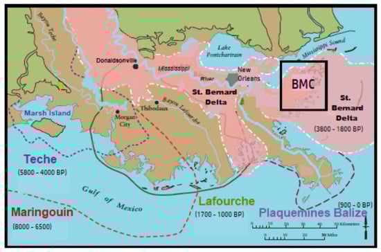 Returning to the Russell et al. [36] observation that Biloxi Marsh is “an abandoned portion of the Mississippi River delta”, we can add that Biloxi Marsh is also a “marginal” deltaic feature. The Mississippi River shifted to the eastern side of its alluvial valley about 4.5 ka. With this move, the River abandoned nearly 4.0 ka of inner-shelf delta building west of where the Mississippi River alluvial valley entered the Gulf [39,40,44]. It then created, for the first time in the Holocene since sea level stabilized, an east-facing deltaic discharge in the vicinity of what is now New Orleans (Figure 5).