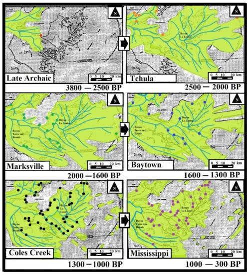 The St. Bernard sub-delta built rapidly during the 400 years of the Marksville period. The Bayou La Loutre course of the Mississippi River mainstem and its distributaries extended across the inner shelf 20 to 30 km east of the current position of the Chandeleur Islands [48,49,50,51,57]. The sub-delta achieved its greatest subaerial extent about 1.8 ka, when the oldest, north trending distributaries in Biloxi Marsh began to lose flow to a southerly sub-delta channel in the Bayou Terre aux Boeufs course (Figure 6). Marksville people established sites on the oldest and highest natural levees of distributaries on the west side of Biloxi Marsh, and along the eastern shore of Lake Borgne.