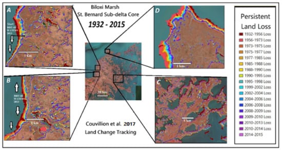 The fourth land-loss interval (2001 to 2010) includes the impacts of Hurricane Katrina (2005) which tracked directly over Biloxi Marsh (Figure S1). Barras [90] showed that this powerful storm caused an anomalously high one-year land-loss of 100 km2 in the Breton Sound marshes just south of Biloxi Marsh (Figure 3). Biloxi Marsh endured a 5.5 m storm surge, but emerged comparatively unscathed (Figure S1). The most recent Biloxi Marsh loss rates are not particularly high by historical (1–3 km2-y−1), or certainly by mid-Holocene standards (10 km2-y−1), even with the recent increase in global sea level rise [89].