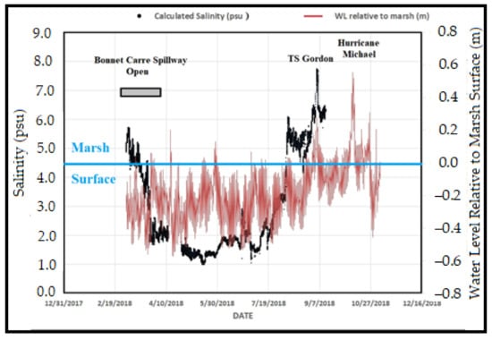Rounsefell [70] measured salinity at a number of stations across Biloxi Marsh in 1959 and 1960, prior to dredging of the MRGO. Since MRGO has been dammed, salinity has also been monitored at these stations by a number of researchers [18,71,72,73]. Results show that salinity levels in Lake Borgne and Biloxi Marsh have returned to pre-MRGO levels since closure (Figure S5). Mean annual salinity at the south end of Lake Borgne was 12.5 ppt prior to closure, and has dropped since by 60%, to average 5 ppt. [71]. Biloxi Marsh salinities in 2018 ranged from 1.4 to 23.0 ppt in synoptic surveys made at all Marsh and Rounsefell stations [18]. Mean salinity for the whole study area in 2018 was 10.5 ± 4.4 ppt (Table S1). Salinity was lower during spring when Mississippi River discharge was higher, especially after the Bonnet Carré Spillway was opened (Figure 8), as it was again, twice, in 2019 (Figure 9).