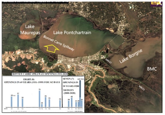 Landsat-8 30 m true-color image showing suspended sediment plume from the Bonnet Carré Spillway in Lakes Pontchartrain and Borgne on 6 March 2019, after the second opening of that year. INSET: Increased usage of Spillway; 8 times in first 70 years; 7 times since 2000 (20 years). Satellite image adapted from LSU Earth Scan Laboratory [92]. Bonnet Carré Spillway openings graphic modified from The Advocate [93].