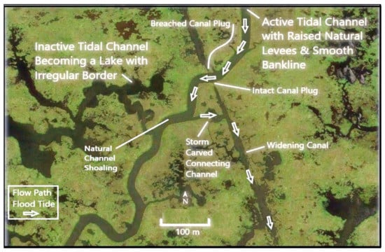 A consequence of the relative antiquity of Biloxi Marsh wetlands compared to other Delta marshes is that tidal channels last longer but change function. Biloxi Marsh is littered with abandoned tidal channel segments—many still with a meandering form—that appear dark in aerial views. These former channels are now disconnected from turbid bays or active tidal channels transporting suspended sediment from surrounding lakes and bays (Figure 10). Unlike active tidal channels, abandoned stream segments in Biloxi Marsh do not naturally maintain elevated banks or revegetate, but instead enlarge into shallow, dendritic lakes with irregular edges. Such abandoned channels tend to disappear relatively quickly in other parts of the sinking Delta, but persist as lakes in Biloxi Marsh [41].