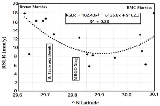The ten to twelve years of data acquired at almost 200 Delta marsh sites under the Coastwide Reference Monitoring System (CRMS) protocol allow for robust comparisons of Biloxi Marsh hydrology, sediment supply and subsidence with data from marshes elsewhere in this Delta and worldwide [18,19,20,78]. Having a mature (>10-year time-series) and spatially distributed network of marsh stations where data are collected in a standardized format at regular intervals is critical input for the ecological models that CPRA applies when considering sites for restoration projects and forecasting land-loss [13,14,15,16,17]. This potential is demonstrated by data from CRMS stations along the 80 km transect running northeast to southwest across Biloxi Marsh and Breton Sound marshes to the Mississippi River (Figure 3). Results are referenced by latitude for nine CRMS stations in Biloxi Marsh and six in the Breton Sound marshes (Table S3). The Biloxi Marsh zone is extended far enough south from the peninsula to include points along Bayou Terre aux Boeufs, as this marsh is genetically part of the St. Bernard sub-delta (Figure 6). The Breton marshes south of Bayou Terre aux Boeufs are much younger, dating from the Plaquemines/Balize sub-delta phase, which did not begin until 0.9 ka, 1 ka after the St. Bernard sub-delta was abandoned by the Mississippi River (Figure 5).