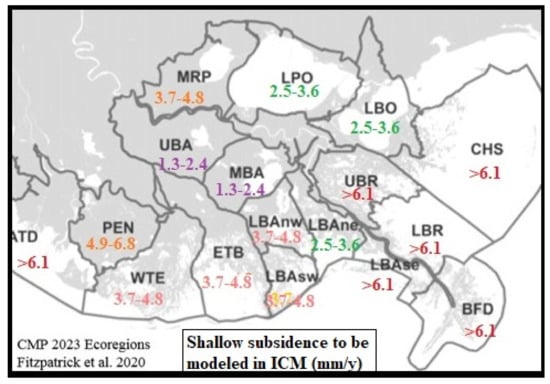 - Fitzpatrick, C.; Jankowski, K.L.; Reed, D. 2023 Coastal Master Plan: Determining Subsidence Rates for Use in Predictive Modeling, Version 1; Coastal Protection and Restoration Authority Tech. Rept: Baton Rouge, LA, USA, 2021. Available online: https://coastal.la.gov/wp-content/uploads/2021/03/Subsidence-Rates_Mar2021.pdf (accessed on 27 June 2021).