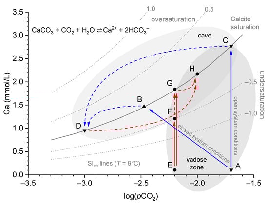 - The water arrives saturated in the cave but encounters a higher pCO2 than in the vadose zone, or it has been saturated under closed system conditions, replenishing the spent CO2 from the cave air (E to G to H).