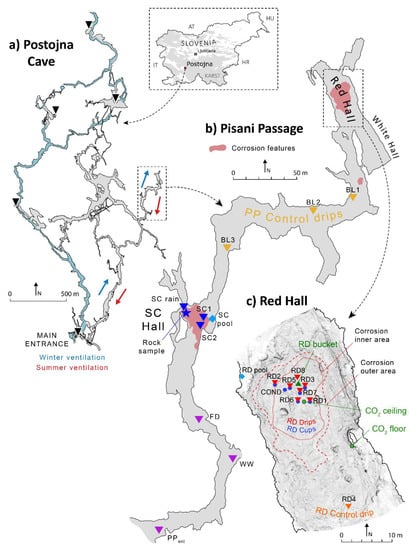 - Prelovšek, M.; Šebela, S.; Turk, J. Carbon Dioxide in Postojna Cave (Slovenia): Spatial Distribution, Seasonal Dynamics and Evaluation of Plausible Sources and Sinks. Environ. Earth Sci. 2018, 77, 289. [Google Scholar] [CrossRef]