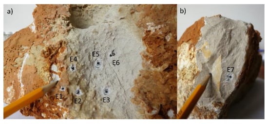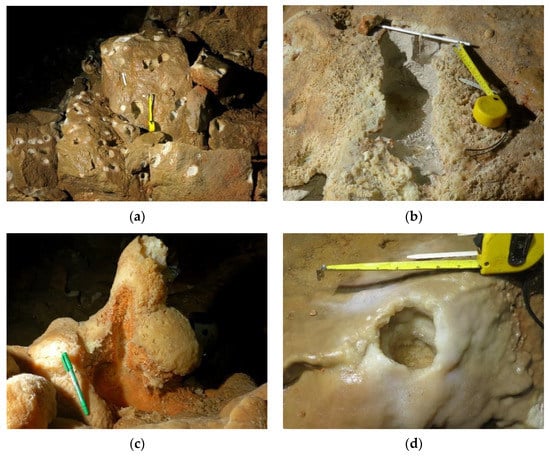- Inner corrosion area—contains only cups with bare rock surfaces and corroded speleothems (see the examples in Figure 3a–c).