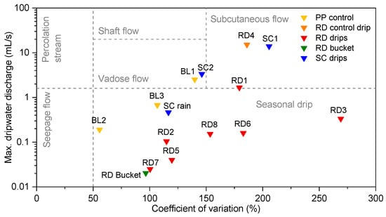 - Baker, A.; Barnes, W.L.; Smart, P.L. Variations in the Discharge and Organic Matter Content of Stalagmite Drip Waters in Lower Cave, Bristol. Hydrol. Process. 1997, 11, 1541–1555. [Google Scholar] [CrossRef]
