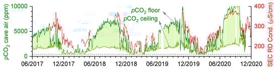 - Smith, A.C.; Wynn, P.M.; Barker, P.A.; Leng, M.J. Drip Water Electrical Conductivity as an Indicator of Cave Ventilation at the Event Scale. Sci. Total Environ. 2015, 532, 517–527. [Google Scholar] [CrossRef] [Green Version]