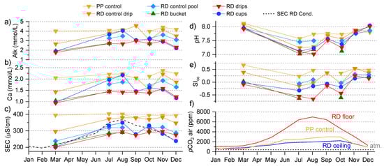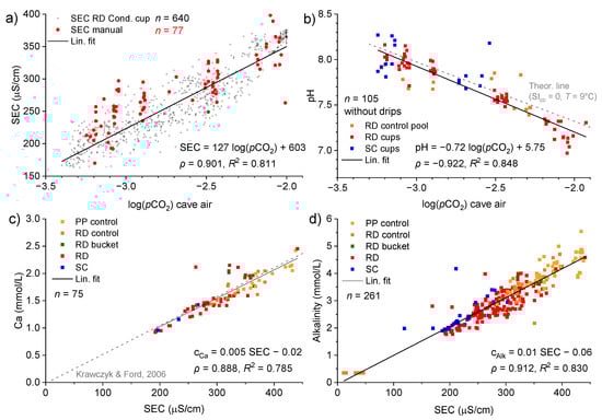 - Faimon, J.; Ličbinská, M.B.; Zajíček, P.; Sracek, O. e Partial Pressures of CO2 in Epikarstic Zone Deduced from Hydrogeochemistry of Permanent Drips, the Moravian Karst, Czech Republic. Acta Carsologica 2012, 41, 47–57. [Google Scholar] [CrossRef] [Green Version]