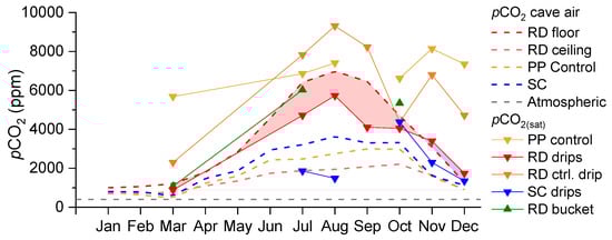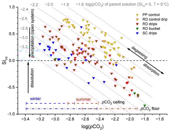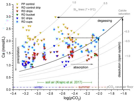 - The dripping water degasses and equilibrates to the low pCO2 of the cave air, but after a conceivable increase in pCO2, it equilibrates to this new state (C to D to H).