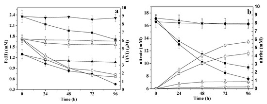 - Li, B.; Pan, X.; Zhang, D.; Lee, D.J.; Al-Misned, F.A.; Mortuza, M.G. Anaerobic nitrate reduction with oxidation of Fe(II) by Citrobacter Freundii strain PXL1–a potential candidate for simultaneous removal of As and nitrate from groundwater. Ecol. Eng. 2015, 77, 196–201. [Google Scholar] [CrossRef]