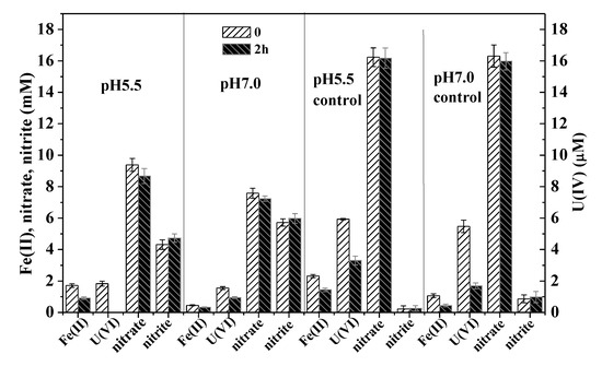 Figure 3 shows the changes in Fe(II), U(VI), nitrate, and nitrite concentrations in the groundwater samples over a 2 h oxidation period after 96 h of incubation. The Fe(II) concentrations in the inoculated pH 5.5 and pH 7.0 samples dropped rapidly by 33.6% and 9.2% compared to the 37.3% and 58.9% losses in the pH 5.5 and pH 7.0 control samples over 2 h of oxidation (Figure 3). This means that Fe(II) is much more vulnerable to oxidation by oxygen than to bacterial oxidation. The U(VI) concentrations simultaneously decreased by 30.0% and 9.8% in the pH 5.5 and pH 7.0 inoculated samples, while 42.3% and 60.9% were lost in the pH 5.5 and pH 7.0 control samples (Figure 3). This rapid and efficient immobilization of U(VI) in oxic conditions can be explained by the fact that abiotically produced Fe(III) oxides have a better binding capacity for U(VI) than biogenic Fe(III) oxides [47]. During the 2 h oxidation period, the nitrate concentrations in both the inoculated pH samples decreased slightly (p > 0.05) while the nitrite concentrations slightly increased (p > 0.05) (Figure 3),implying, therefore, that the facultative bacterium Clostridium sp. PXL2 was still active in oxic conditions.
