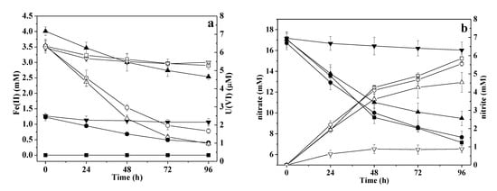 The effects of pH on changes in Fe(II), U(VI), nitrate, and nitrite concentrations during the growth of Clostridium sp. PXL2. ■ and □, pH 5.5; ▼ and ▽, pH 5.5 (non-inoculated control ①); ● and ○, pH 7.0; ▲ and △, pH 7.0 (uninoculated control ②). Filled symbols, Fe(II) and nitrate; open symbols, U(VI) and nitrite. (a), Fe(II) and U(VI); (b), nitrate and nitrite. Data shown are means ± SD (n = 3).