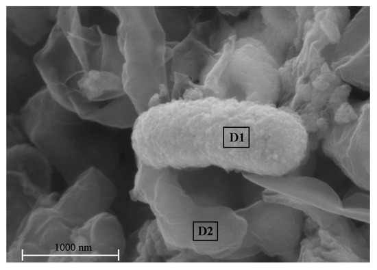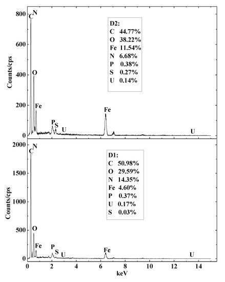 Figure 5 shows Clostridium sp. PXL2 and sediments containing various concentrations of Fe(II), U(VI), and other elements. The Clostridium sp. PLX2 cells were approximately 1.8 μm in length. Amorphous iron oxides were observed on the cell surfaces and crystalline iron oxides were not observed. The formation of amorphous iron oxides by some other AFODN species has also been reported [49,50]. Figure 6 shows the elemental composition of the sediments around the bacteria cells. The following, including C, O, N, Fe, and a small of proportion of P, U, and S based on their weight, primarily formed the sediments’ composition. The U(VI) percentages were 0.17% and 0.14% for D1 and D2 spots, indicating that the U(VI) was mainly immobilized due to adsorption on iron oxides produced by Clostridium sp. PXL2. The slightly higher content of U(VI) in D1 could be attributed to biosorption by bacterial cells [9].