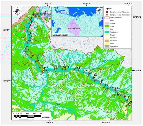The Ob River and tributaries sampling points (solid and open circles, respectively) showing the dominant landscapes of the Ob River basin.