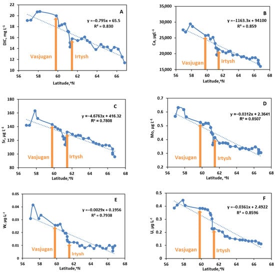 Latitudinal trends of labile major and trace elements decreasing their concentrations in the main stem of the Ob River from the south to the north: DIC (A), Ca (B), Sr (C), Mo (D), W (E) and U (F). The two main tributaries likely to control DOC and trace metal delivery, rivers Vasjugan and Irtysh, are shown by arrows.